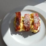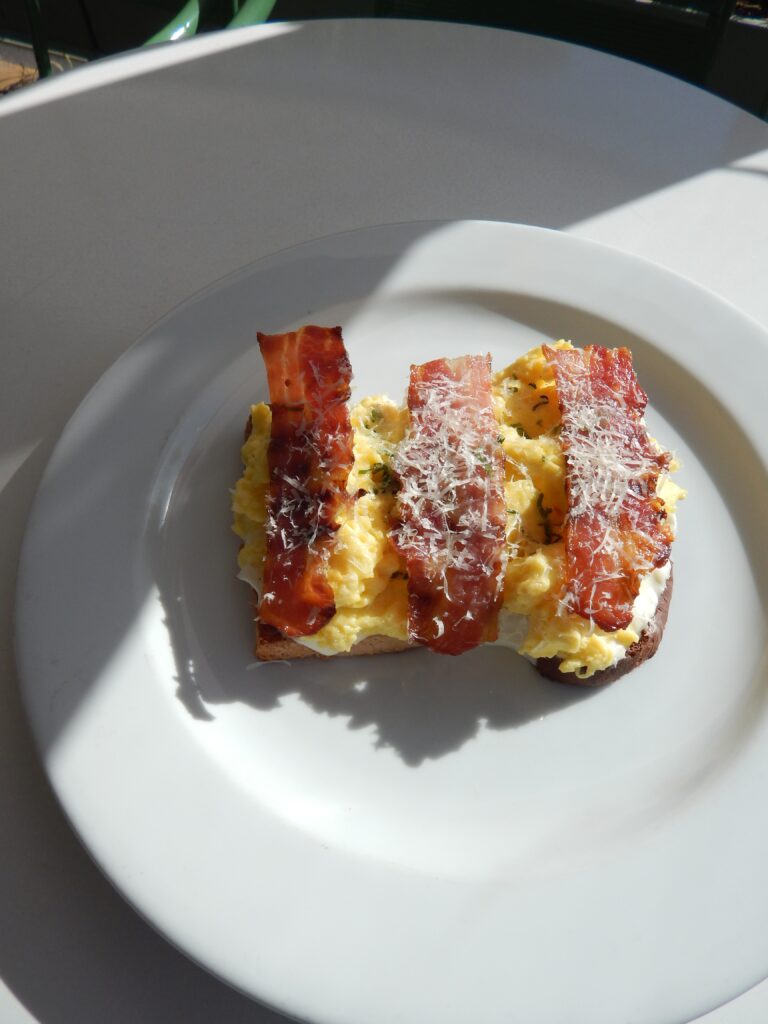 Huevos revueltos, Panceta, Tostada en Pan de Molde, Queso Crema y Parmesano.