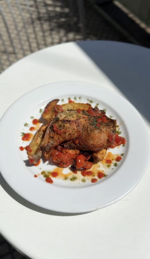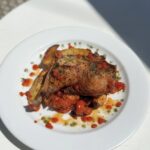 Masa de hongos en sus jugos de coccion & pomodoro + yogurt citrico y aceite de menta con crocante de berenjenas