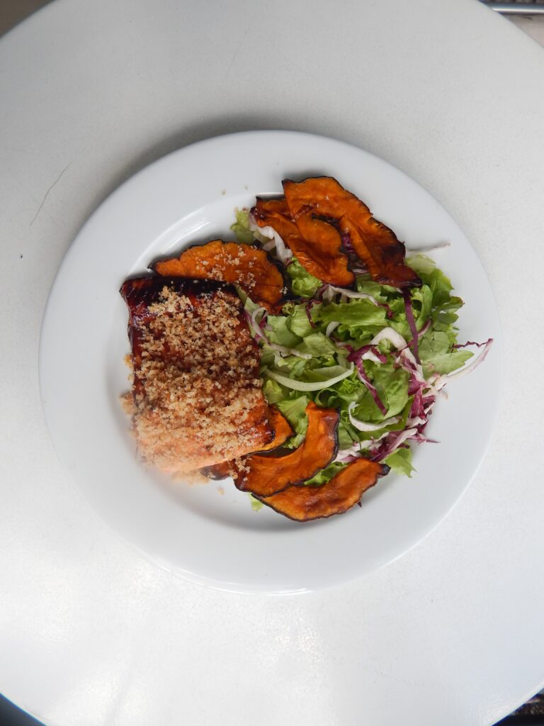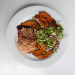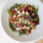rúcula, langostinos, palta, cebolla morada, perejil & dressing de mango.